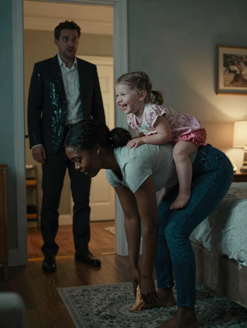 There stood Maya, the new maid he’d reluctantly hired just weeks earlier. Her dark hair was swept back into a neat ponytail, her posture unwavering like a pillar of strength. Balanced atop her broad back was Sophie, her tiny hands clutching Maya’s shoulders, her legs trembling—but crucially, her feet touching the floor.