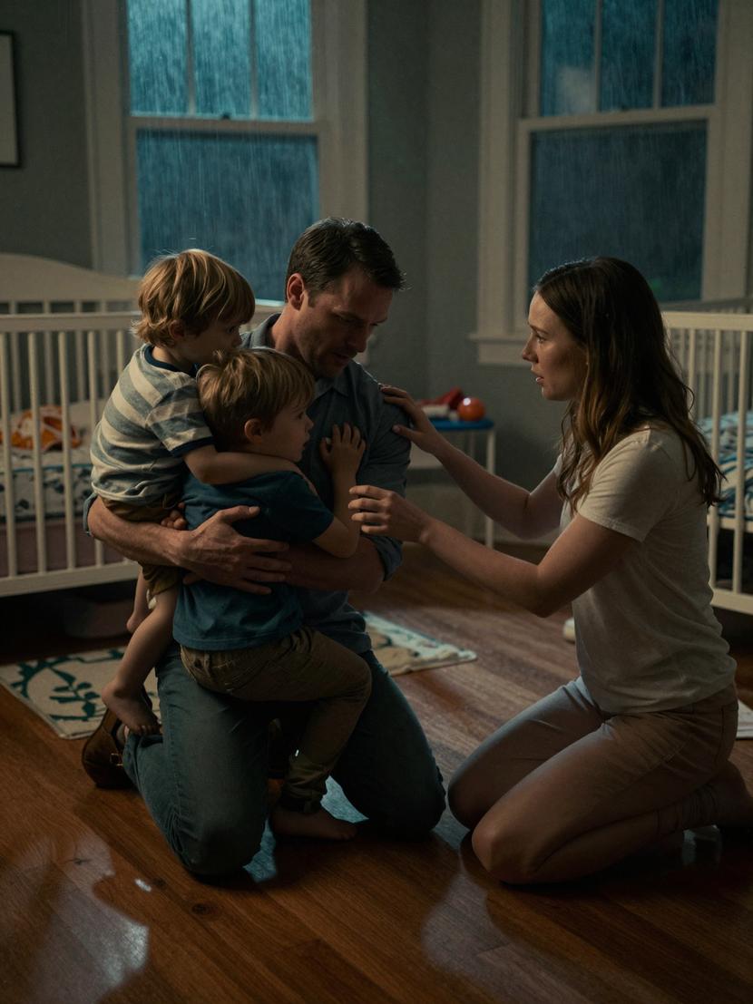 But the scene that met him stopped his heart. The boys huddled into a corner, wrapped in blankets, trembling violently. Rebecca knelt among them, arms trying to soothe, but the roaring storm drowned out every soft word.