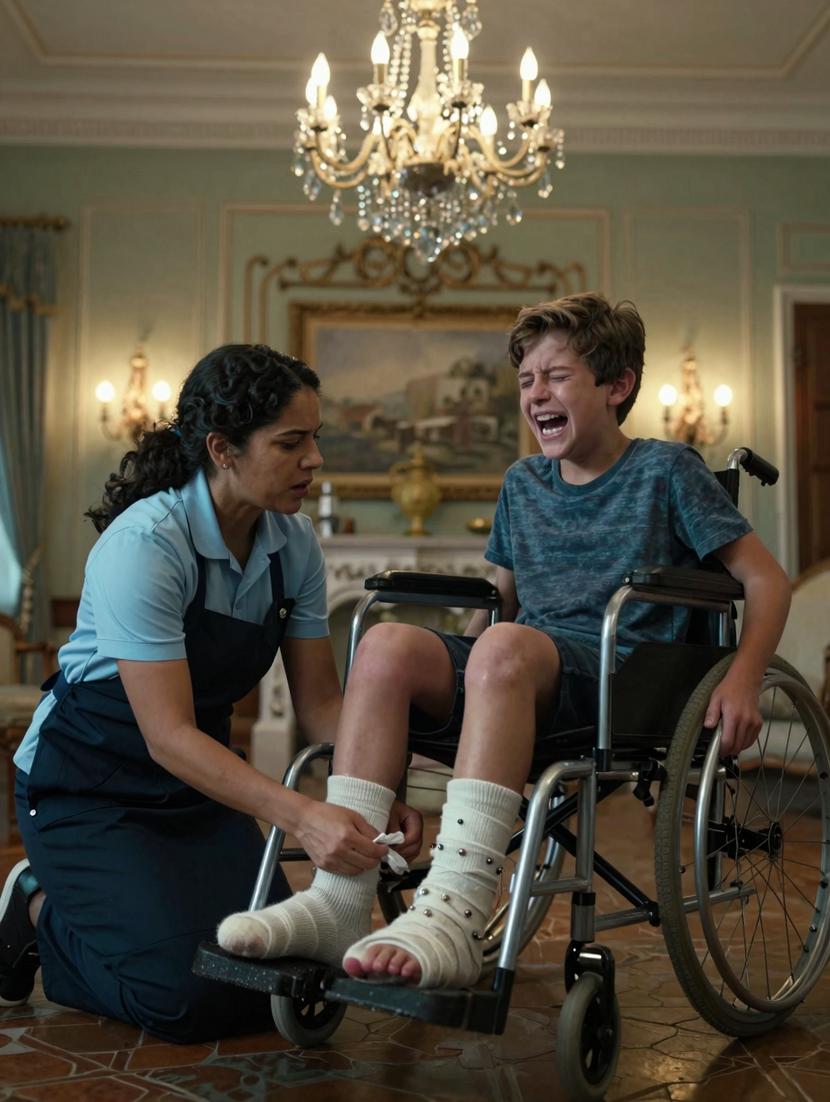 At the room’s heart, beneath a chandelier dazzling enough to eclipse dreams, sat Mateo—only seven—but his skin was pale as wax, his eyes sunken deep into hollow shadows that screamed desperation louder than any words he refused to utter. Bound not by chains but by an invisible terror that rooted him to the wheelchair, Mateo seemed imprisoned within his own body.