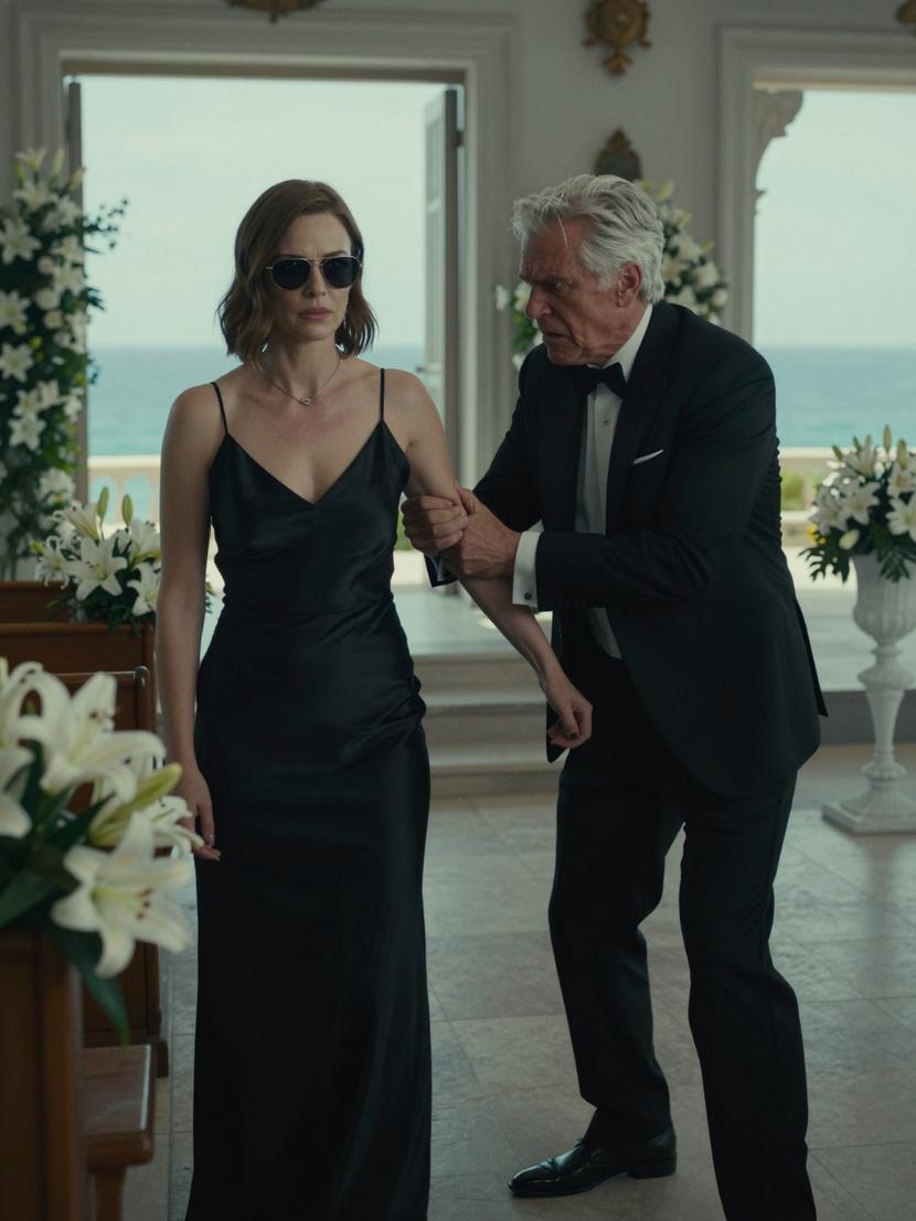 A harsh wind tugged angrily at the hem of Elena’s dress. She hadn’t chosen soft pastels to blend with the bridal party, nor the delicate floral prints that echoed the hydrangeas lining the aisle at The Gables—her father Adrian’s lavishly rented open-air chapel perched precariously by the ocean’s edge. No, Elena wore black: a stark silk slip dress, sharp and commanding, casting a tall shadow beneath the dismal overcast light. It was the color of mourning, yes, but also the color of quiet judgment.