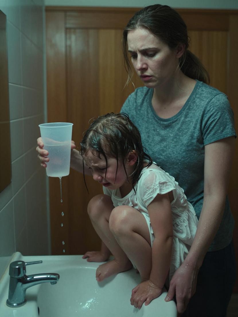 “Ach,” sagte sie lässig und senkte den Becher, ohne ihn fallen zu lassen. “Ich wollte sie nur aufwecken. Ein Unfall – der Wasserhahn hat sie eingenebelt.”