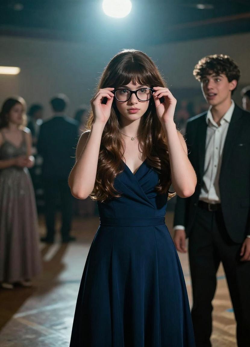 The gym had been transformed with an illusion of grandeur, draped in swaths of white fabric cascading from the rafters like mist. A rented disco ball spun lazily above, catching flecks of light that scattered like fireflies across hundreds of young faces—each one seemingly certain of their place in the story tonight, except Mara’s. She hovered near the punch table, her fingers curling around a plastic cup she never once lifted to her lips. Her navy blue dress was deliberately understated, chosen to fade into the shadows rather than invite attention. Thick glasses framed her eyes like armor, and the wig concealed her true hair like a silent sentinel, a disguise perfected over years not from ignorance of notice, but from a cautious desire to remain unseen.