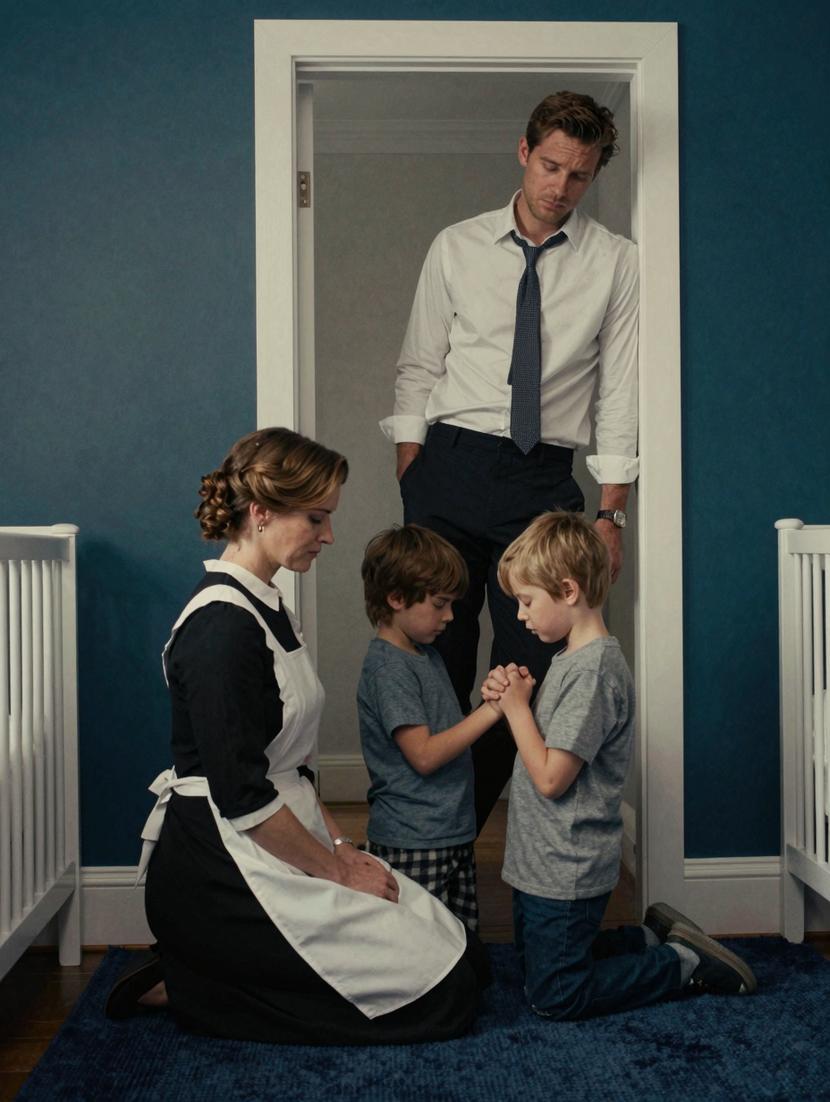 Before him, kneeling on the plush navy carpet, was Hannah—the new nanny assigned to his boys. Logan only ever learned her name through passing remarks from his assistant; they had never truly met. She wore the agency’s modest uniform—a simple black dress kissed with a white apron, vintage in contrast to the nursery’s sleek, modern design. But it wasn’t Hannah who stole Logan’s breath away.