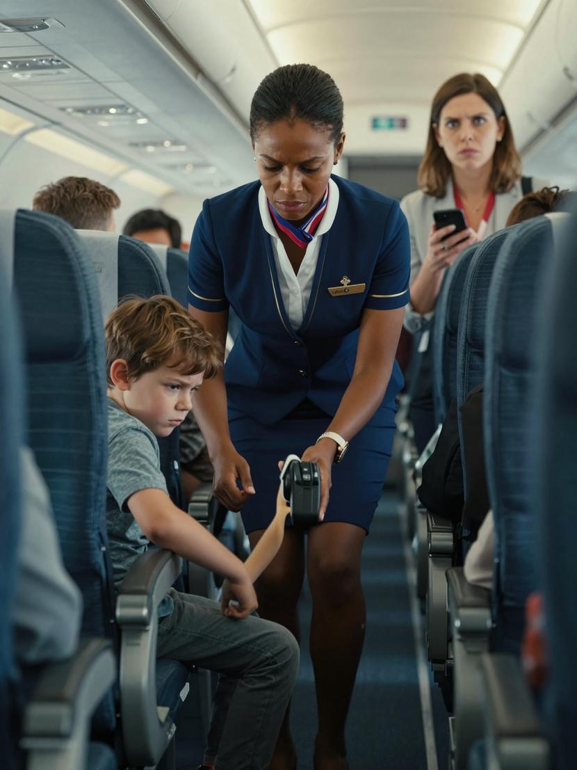 Morgan, the flight attendant, approached swiftly, kneeling to meet Evan’s gaze. Her voice was soft but authoritative as she asked him to cease. It was then that Laura finally glanced up, her disdain sharp and cold. “He’s just a child,” she snapped harshly. “You people are always so sensitive.”