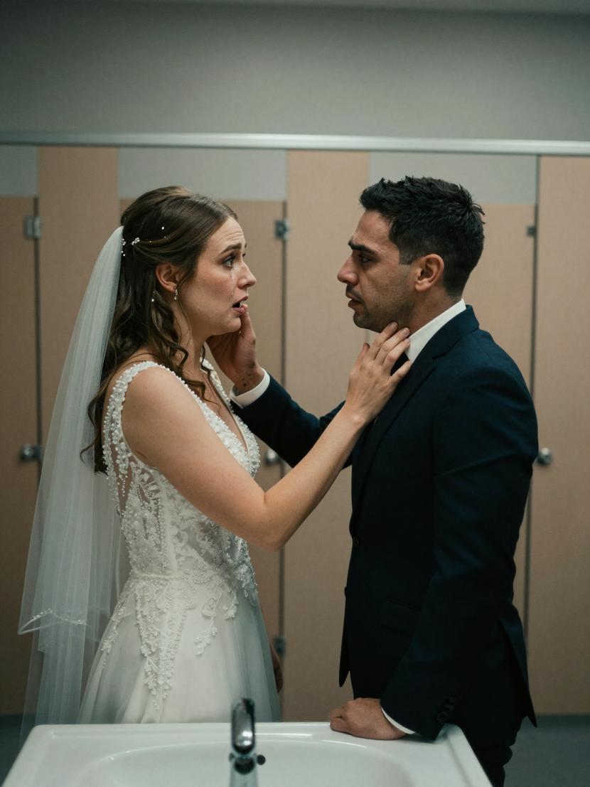 The restroom was dimly lit, echoing the muffled sounds of celebration beyond its walls. He was already there, leaning against the sink, his face shadowed and tense. Silence stretched until he finally broke it.